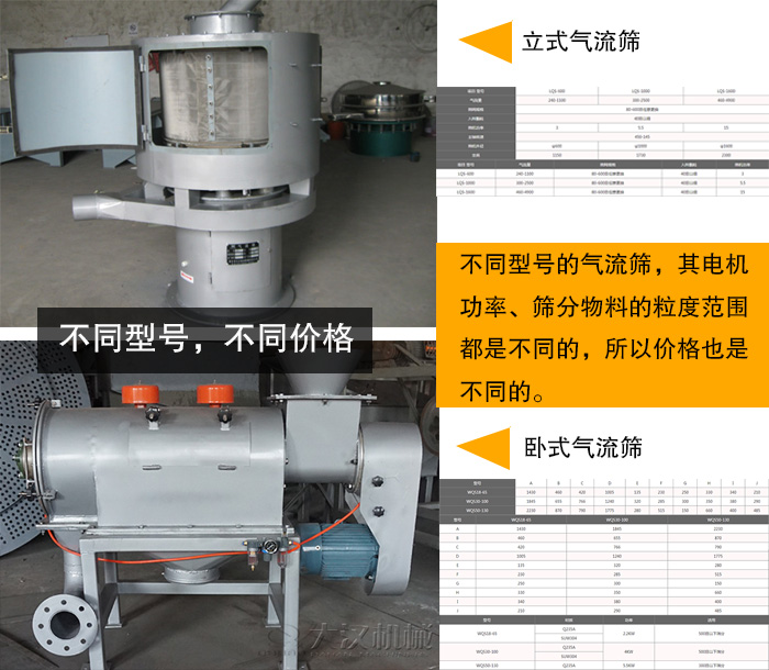 大漢氣流篩分為立式氣流篩和臥式氣流篩。 立式氣流篩型號(hào)有LQS-600型、LQS-1000型、LQS-1600型等,該機(jī)適合80-530目有網(wǎng)各種粉狀物料篩選分級(jí),如:中藥粉、石墨粉、粉煤灰、活性炭等,篩分效率高、產(chǎn)量大、自動(dòng)進(jìn)料排料、連續(xù)作業(yè)。臥式氣旋篩型號(hào)有WQS18-65型、WQS30-100型、WQS50-130型特別適用篩選精細(xì)粉末、密度小(比重輕)、輕微濕度、易附粘性粉或有精電反應(yīng)的物料,不同型號(hào)的氣流篩,其電機(jī)功率、篩分物料的粒度范圍都是不同的,所以價(jià)格也是不同的。