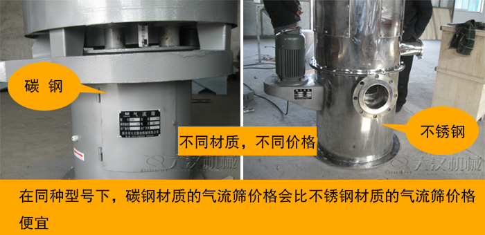 氣流篩材質(zhì)分為不銹鋼和碳鋼兩種,不銹鋼材質(zhì)的氣流篩防腐性能好,所以其價(jià)格會(huì)比碳鋼貴,所以,在同種型號(hào)下,碳鋼材質(zhì)的氣流篩價(jià)格會(huì)比不銹鋼材質(zhì)的氣流篩價(jià)格便宜。