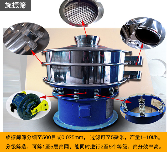 旋振篩可以篩選顆粒、粉末、粘液一定范圍內(nèi)均可篩選。篩分細(xì)至500目或0.025mm, 過(guò)濾可至5微米,產(chǎn)量1-10t/h。分級(jí)篩選,可篩1至5層篩網(wǎng),能同時(shí)進(jìn)行2至6個(gè)等級(jí),一般情況下,不建議超過(guò)3層的設(shè)計(jì),層數(shù)過(guò)多,影響篩分精度。
