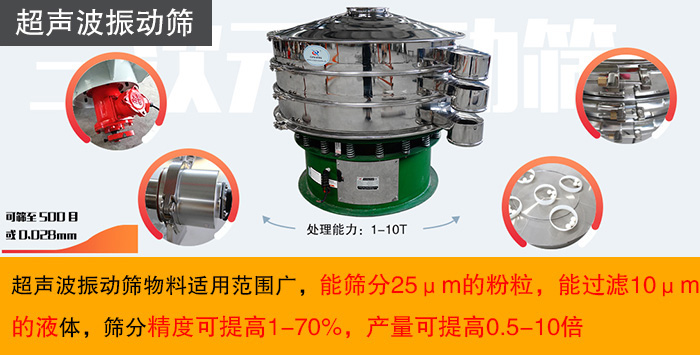 超聲波振動(dòng)篩物料適用范圍廣,能篩分25μm的粉粒,能過(guò)濾10μm的液體,篩分精度可提高1-70%,產(chǎn)量可提高0.5-10倍。