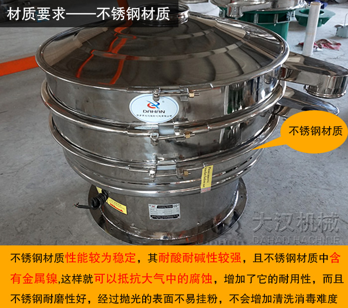 以上是關(guān)于食品行業(yè)振動(dòng)篩的選型要素,用戶可作為參考。另外,新鄉(xiāng)大漢振動(dòng)機(jī)械有限公司專門針對(duì)食品、醫(yī)藥等對(duì)衛(wèi)生有嚴(yán)格標(biāo)準(zhǔn)的行業(yè),研制了一款新型振動(dòng)篩設(shè)備—食品振動(dòng)篩,符合食品標(biāo)準(zhǔn)。如需了解更多有關(guān)價(jià)格、型號(hào)等信息,可隨時(shí)咨詢我們。