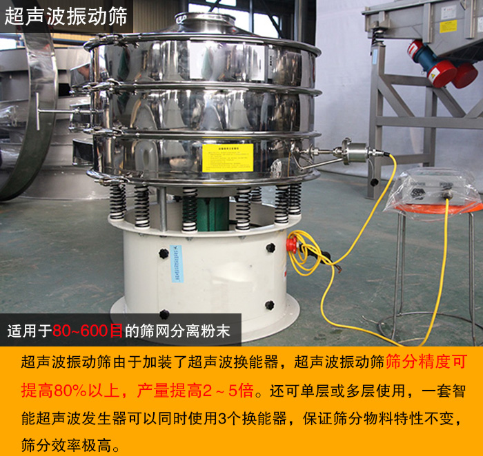 超聲波振動篩分機是將超聲波控制器與旋振篩有機結合在一起,將220V、50HZ或110V、60HZ電能轉化為18KHZ的高頻電能,輸入超聲波換能器,將其變成15KHZ機械振動,從而達到該校篩分和清網的目的。當超聲波振動篩啟動時,其電源產生的高頻電通過換能器轉換成高頻正弦形式的縱向振蕩波,這些振蕩波傳到共振器上使共振器產生共振,然后由共振器將振動均勻地傳輸至篩面在篩網上面疊加一個高頻率低振幅的超聲振動波,超微細粉體接受巨大的超聲加速度,使篩面上的物料始終保持懸浮狀態(tài),從而抑制粘附、摩擦、平降等堵網因素,從而有效解決了強吸附、易聚團、高靜電、高精細、高密度、輕比重等篩分難題。適用于80~600目的篩網分離粉末,能清晰的分離直徑鄰近的細微顆粒,符合玻璃纖維篩分的要求。