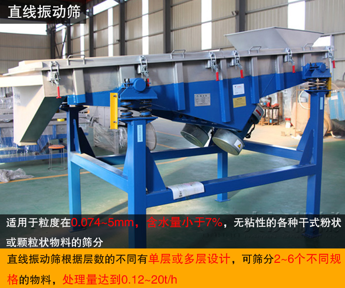 直線振動篩利用兩臺振動電機反向旋轉,使激振器產生反向激振力,并帶動篩箱做前后直線運動,當物料從一端的進料口進入篩箱,均勻分布在篩面上,在激振力和物料自重的合力作用下,物料在篩面上被拋起,向出料口跳躍式前進,后通過各層孔徑大小不一的篩網實現對物料的篩分、分級,物料由每層對應的出料口排出,從而完成整個篩分過程,適用于粒度在0.074~5mm,含水量小于7%,無粘性的各種干式粉狀或顆粒狀物料的篩分,大給料粒度不大于10mm,處理量達到0.12~20t/h,不同型號的直線振動篩產量是不同的,用戶需根據實際產量需求進行合理選擇。