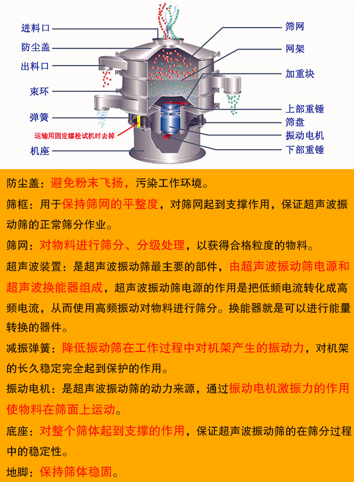 超聲波振動篩主要由防塵蓋、篩框、篩網(wǎng)、超聲波裝置、振動電機、減振彈簧、底座、地腳等部分組成。超聲波振動篩每個結構的作用都是非常獨特的,與篩機的正常運轉(zhuǎn)是密不可分的。下面即是超聲波振動篩各個結構的詳細介紹: