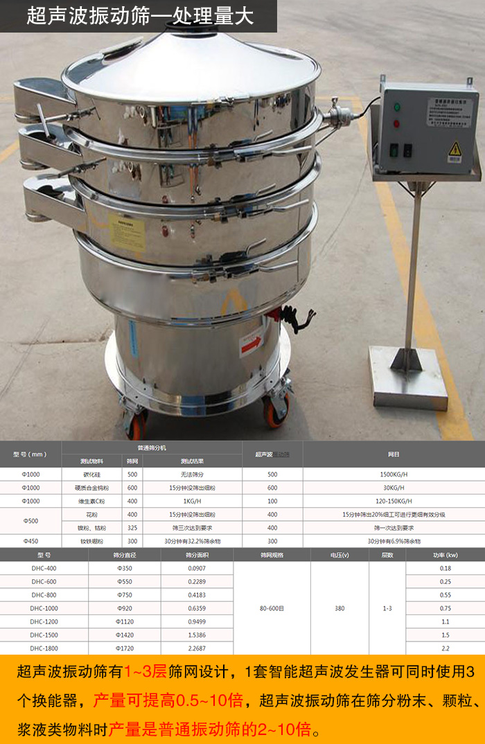 超聲波振動(dòng)篩有1~3層篩網(wǎng)設(shè)計(jì),1套智能超聲波發(fā)生器可同時(shí)使用3個(gè)換能器,產(chǎn)量可提高0.5~10倍,超聲波振動(dòng)篩在篩分粉末、顆粒、漿液類物料時(shí)產(chǎn)量是普通振動(dòng)篩的2~10倍。