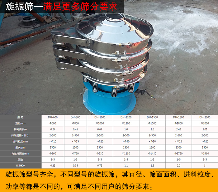 旋振篩型號從DH-600、DH-800、DH-1000、DH-1200、DH-1500、DH-1800、DH-2000,不同型號的旋振篩,其直徑、篩面面積、進料粒度、功率等都是不同的,可滿足不同用戶的篩分要求。