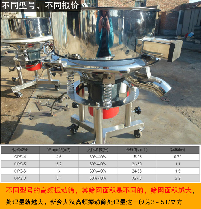 大漢高頻振動(dòng)篩型號(hào)有GTS-4、GTS-5、GTS-6、GTS-8,不同型號(hào)的高頻振動(dòng)篩,其篩網(wǎng)面積是不同的,篩網(wǎng)面積越大,處理量就越大,新鄉(xiāng)大漢高頻振動(dòng)篩處理量達(dá)一般為3~5T/立方,高頻振動(dòng)篩處理量是和其篩網(wǎng)面積有關(guān),篩網(wǎng)面積又是由其型號(hào)決定,所以,型號(hào)不同的高頻振動(dòng)篩價(jià)格就有差異。