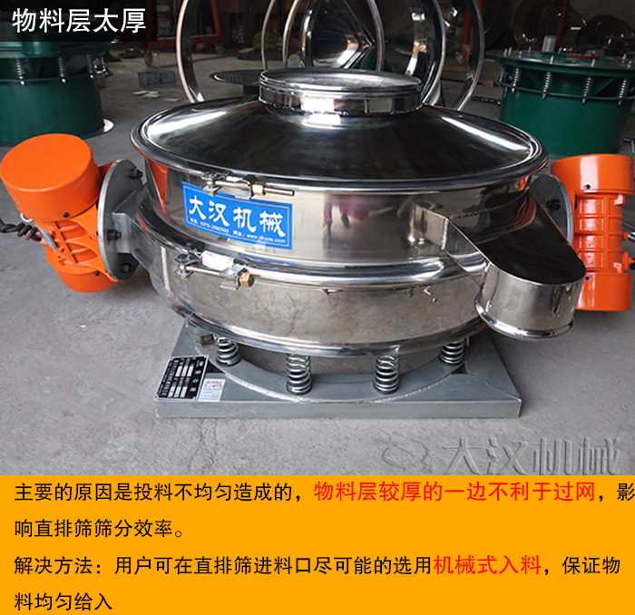 物料料層過厚主要的原因是投料不均勻造成的,物料層較厚的一邊不利于過網(wǎng),影響直排篩篩分效率,用戶可在直排篩進料口盡可能的選用機械式入料,保證物料均勻給入。